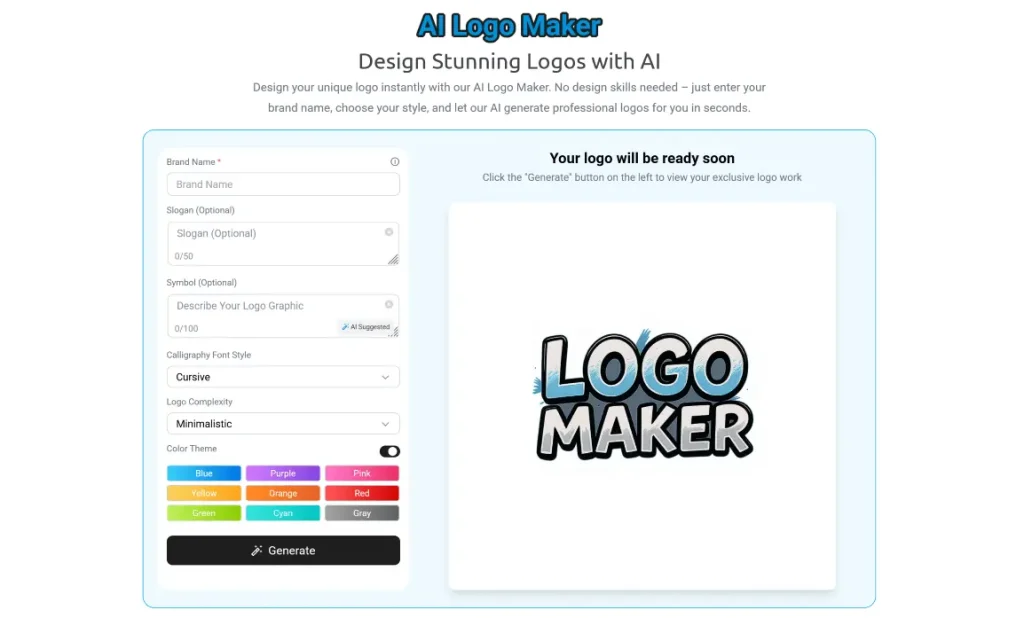 AI Logo Maker by logomaker.design is an AI-powered design tool that generates professional brand logos instantly. Users simply enter their brand name, optionally add a slogan or symbol preference, then select from various font styles, complexity levels, and color themes to guide the AI in creating multiple logo variations within seconds. While the AI handles the creative heavy lifting, users retain control over stylistic elements and can experiment with different combinations until they find a design that matches their brand identity.