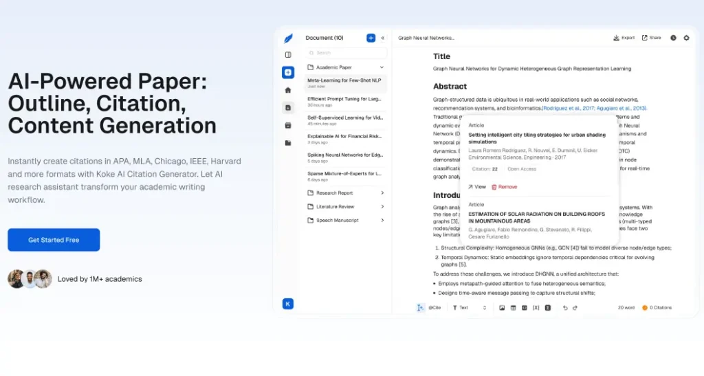 Koke AI is an AI-powered citation generator that helps you create APA, MLA, Chicago, IEEE, and Harvard references in seconds – perfect for student papers, essays, and research projects. To use it, students and researchers can search for sources semantically, automatically generate citations, and have the AI build complete bibliographies. Koke AI also offers features like AI-powered outline generation and an autocomplete function that suggests content based on your existing writing.
